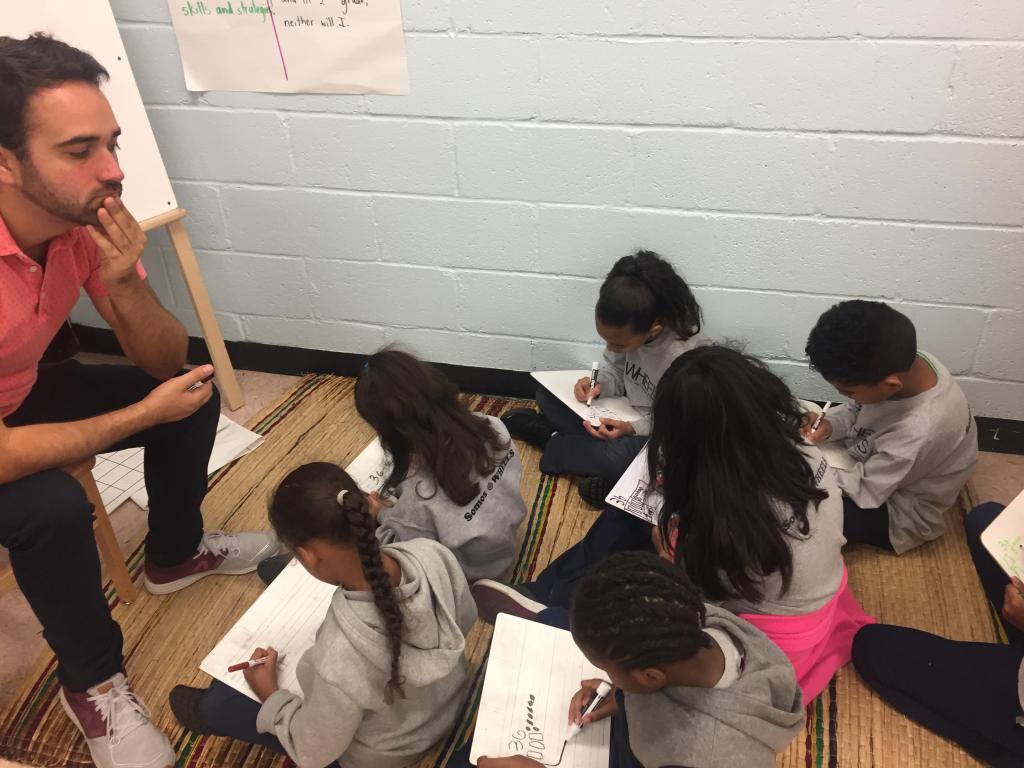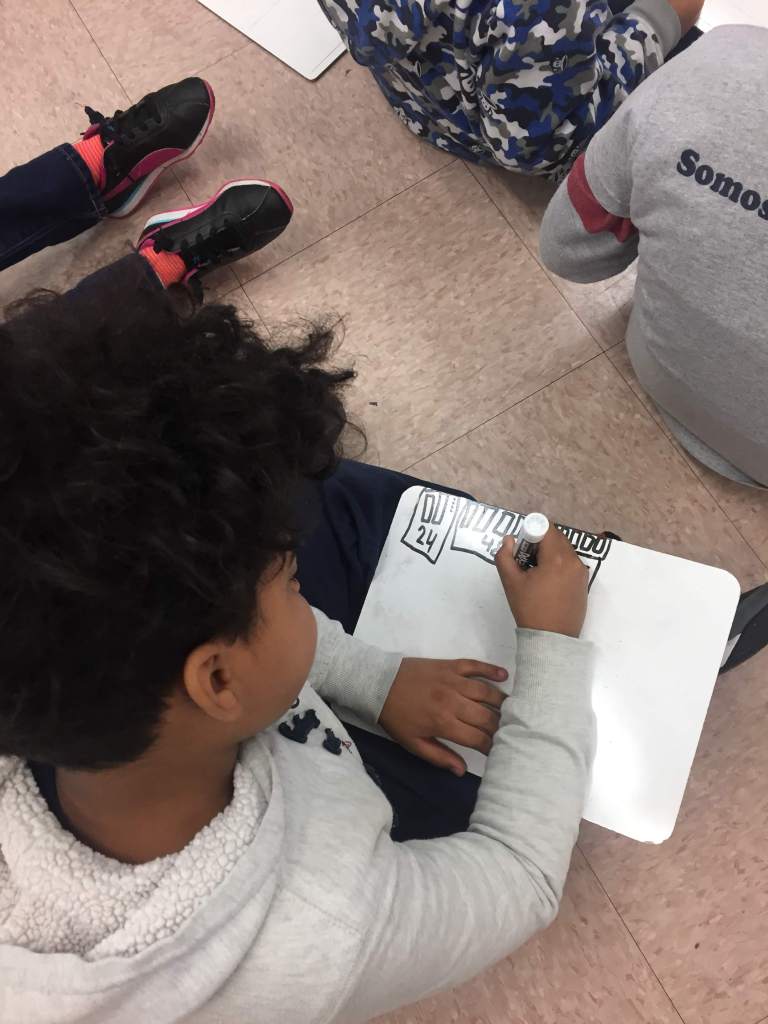 This practice can sometimes be combined with early-stage practice using a math class tool, like mini whiteboards or students’ math notebooks.